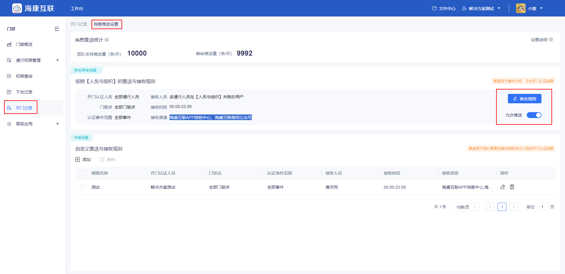 ②管理员在“门禁-开门记录-消息推送设置”中,开启“允许推送”按钮,可修改消息推送的渠道,目前仅支持海康互联微信小程序、海康互联App。
