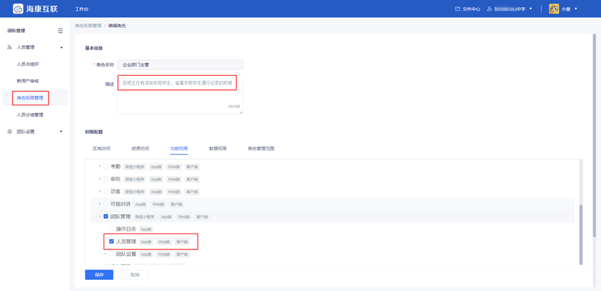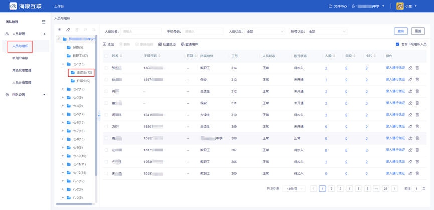 ②创建班级、分配权限:按照学校班级情况创建对应的班级组织,并在下级组织中创建走读生分类。将各班级班主任分别添加至对应班级组织下,并分配人员管理的权限,由各班班主任协助录入走读生信息。