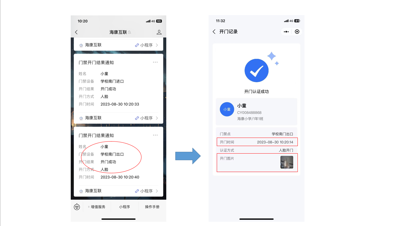 独自上学家长放心:采用门禁一体机(+人员通道),学生通过 刷脸或刷卡 方式进出校区/园区,系统将主动推送通行事件至家长手机微信小程序,方便及时了解孩子动向。