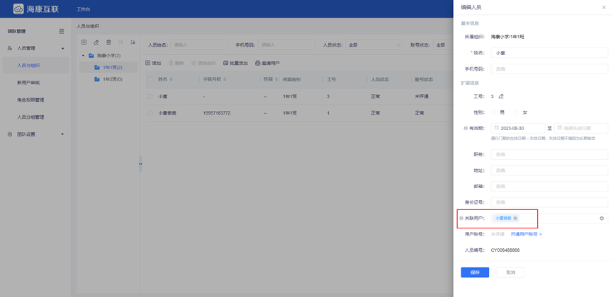 ①管理员在系统中添加学生及家长信息,在学生信息中设置“关联用户”,即接受通行消息推送的人员,示例中设置为学生家长。