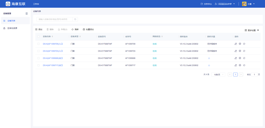 ①设备添加:门禁设备与人员通道进行联动配置,并将4台门禁主机开启萤石云协议后,添加至海康互联云平台。