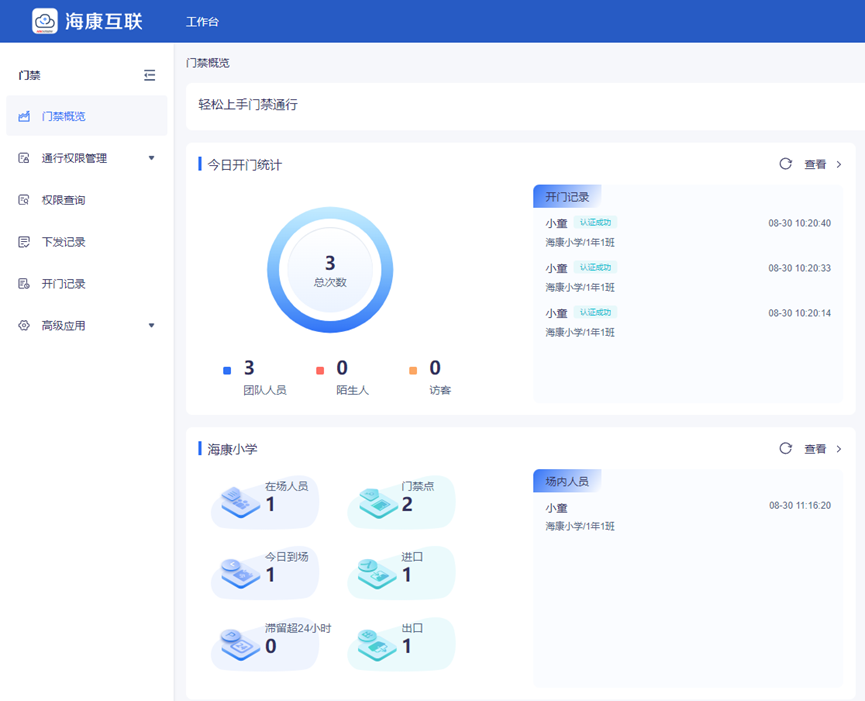 本项目采用双人员通道+4台门禁一体机,搭配海康互联云平台,实现学校上述管理要求。