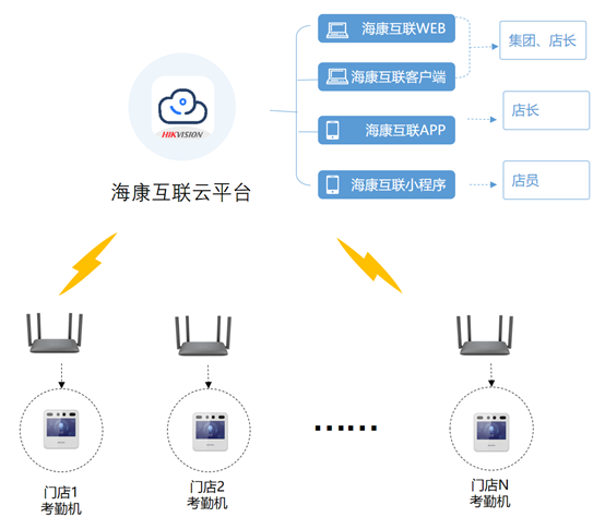 针对连锁门店分布散、组网困难的特点,海康互联采用云平台技术,门店考勤设备联网后,通过海康互联云平台统一管理,实现连锁门店考勤统一管理。