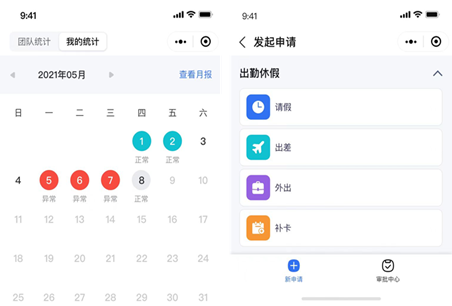 根据Web/App/小程序不同端的特点配置了不同功能,可轻松完成假勤申请、审批、核算。