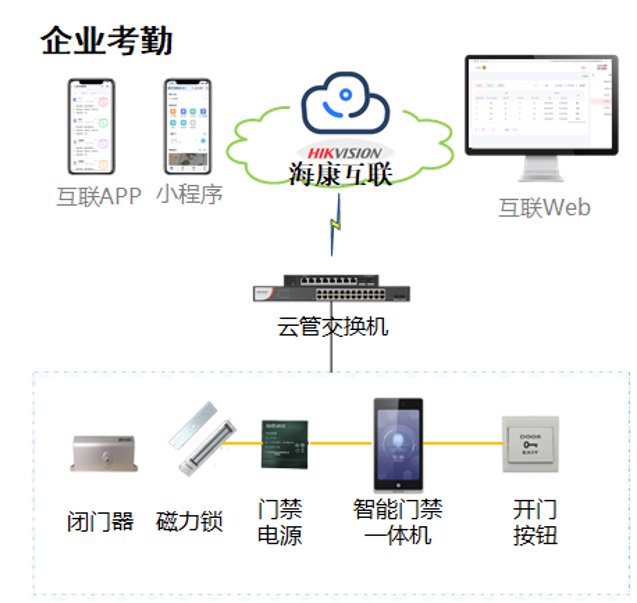 海康威视从前端硬件、后端平台以及用户应用三端入手,设计基于云平台的轻量化、低成本、易交付的假勤管理解决方案: