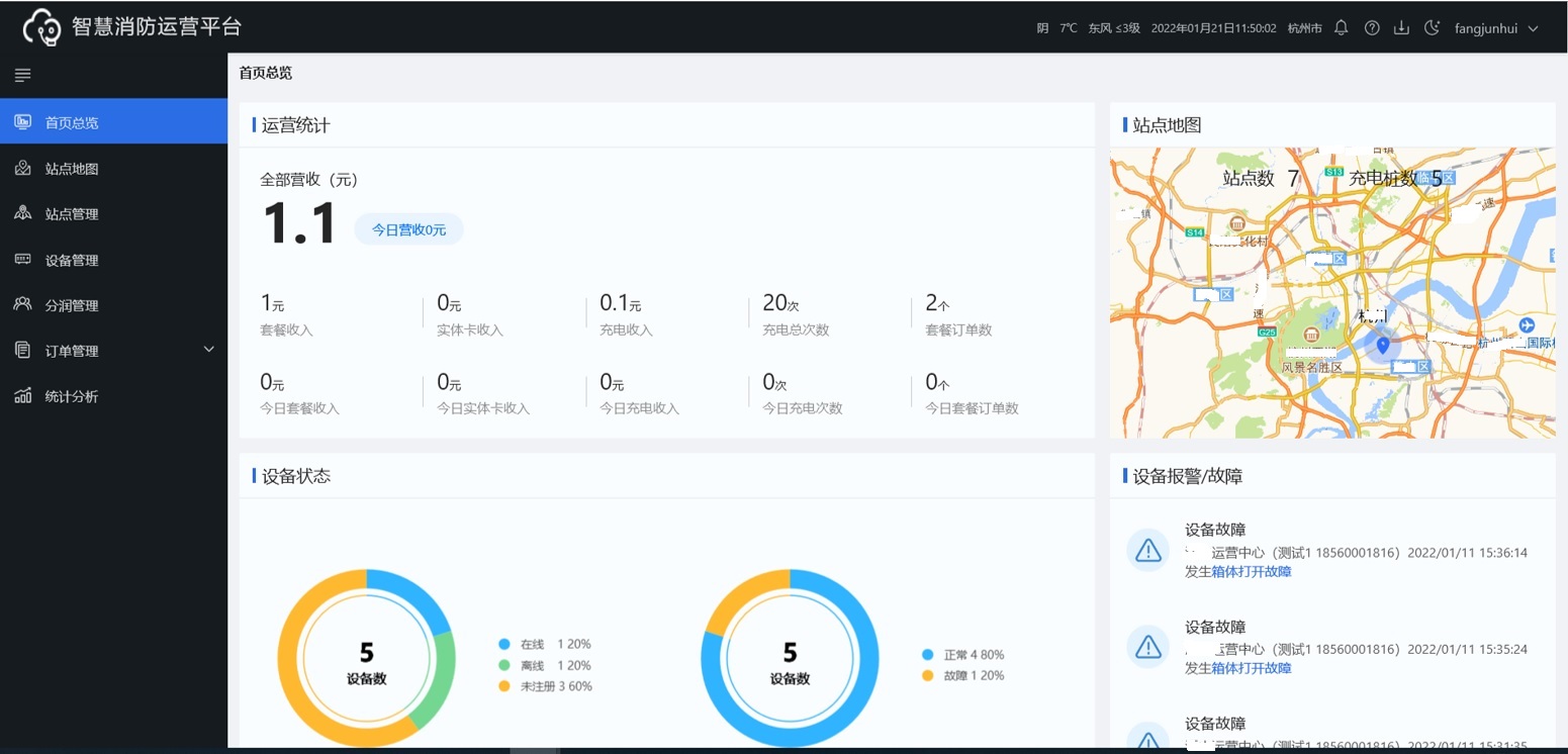 充电桩运营平台web端提供总览、站点地图、站点管理、设备管理、分润管理、订单管理、统计分析七大模块,满足站点日常运营操作及远程视频预览。
