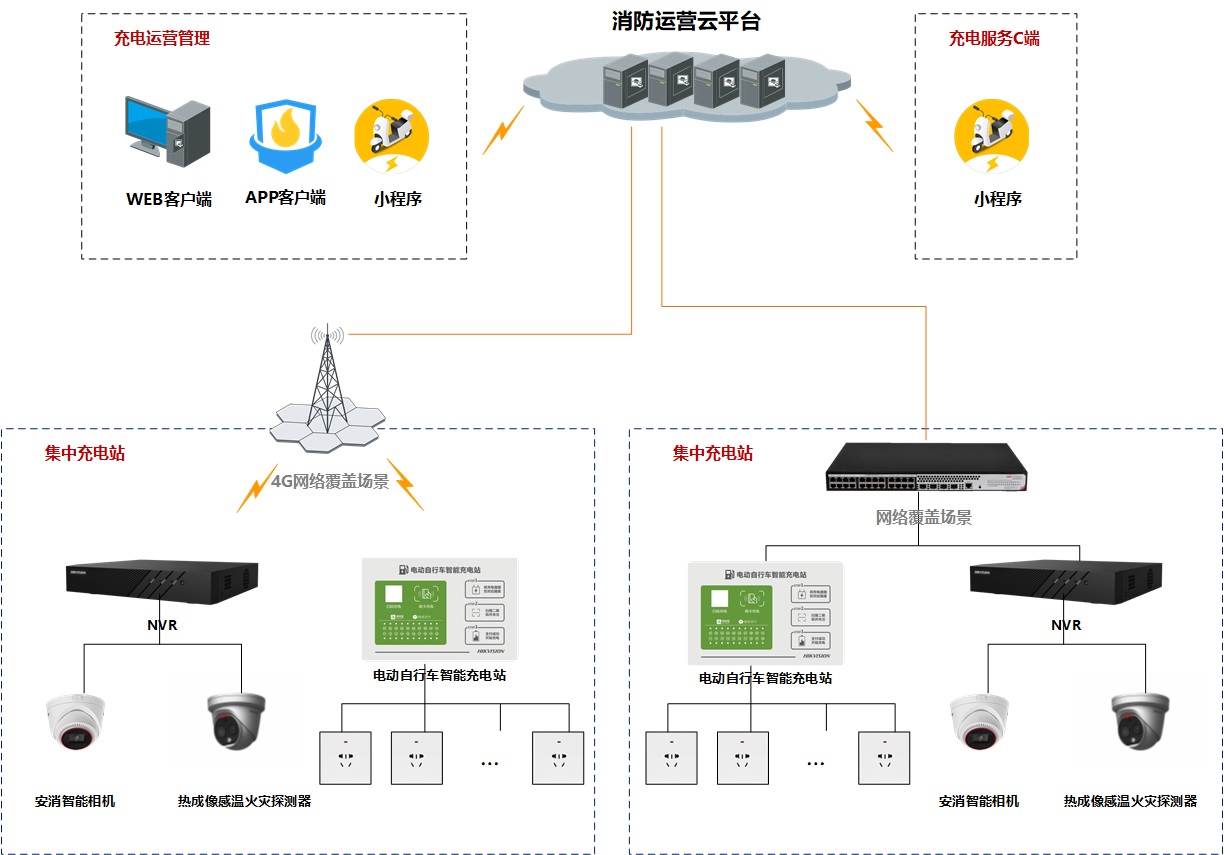 电动自行车集中充电系统包含充电设备、充电用电以及施工运营,涉及多方协同完成,针对电瓶车充电管理的问题,海康威视推出的电瓶车智慧管理解决方案,既能为员工提供简单便捷的电瓶车充电服务,也能帮助物业治理电瓶车违规停放的乱象、增加运营收入,同时还可通过分润的方式为建设方提供持续的运营收益,保障充电服务的持续运行。