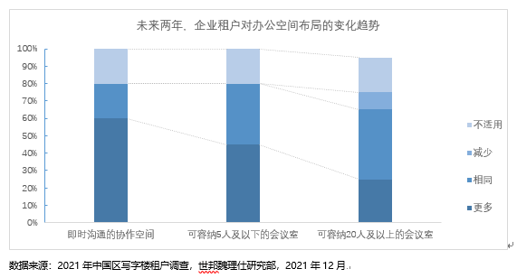 对企业租户而言,提高租赁空间使用效率,降低企业成本,在此背景下, 企业租户对会议室规格的看法有所改变,对小型会议室的需求出现增长,期望打造一个既可用于临时员工沟通或团队工作,又可用于客户洽谈的协作空间。