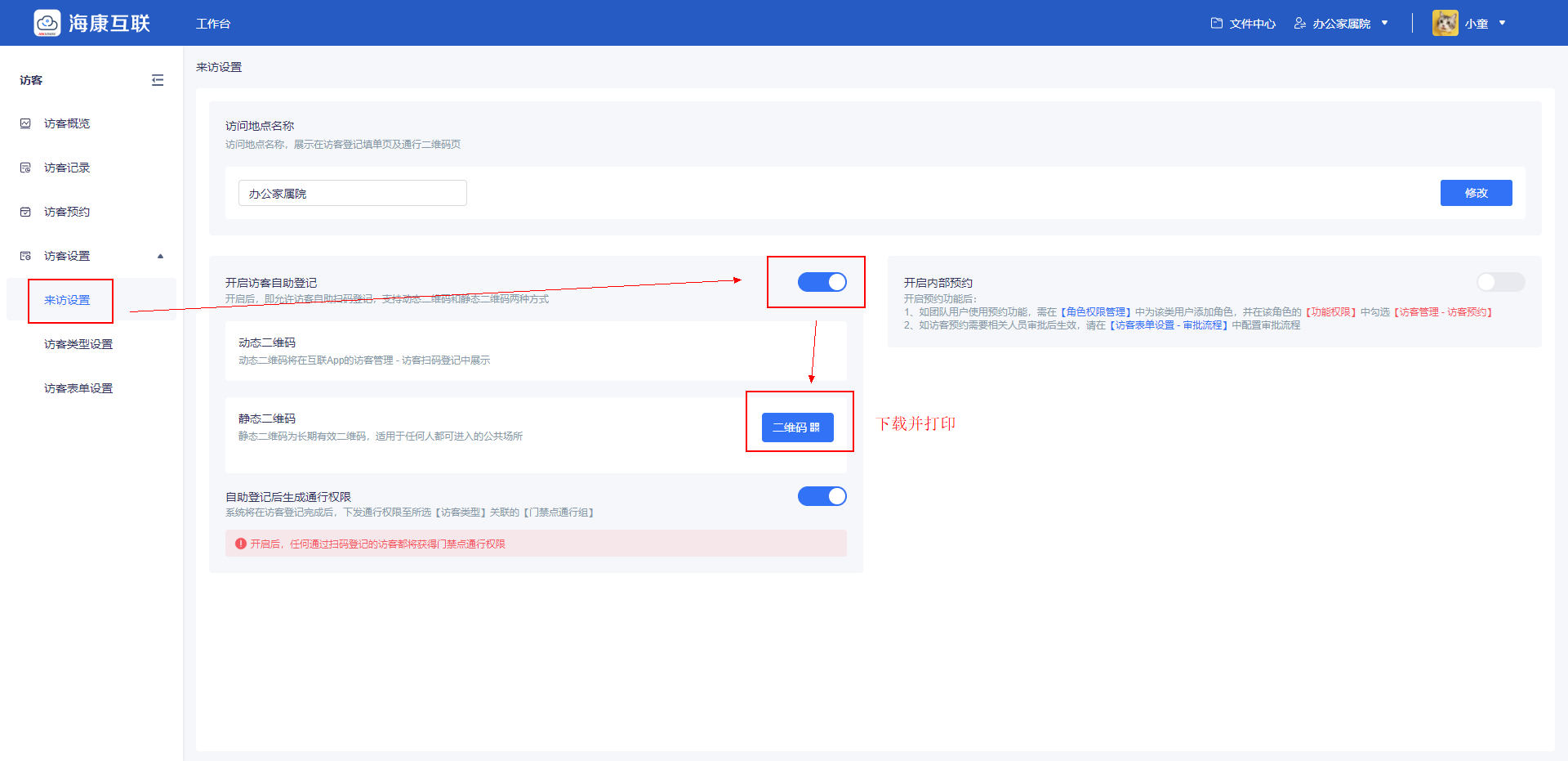 ⑤访客管理:管理员登录海康互联web端,进入“访客-访客设置-来访设置”开启访客自助登记功能,并下载静态二维码打印张贴至出入口,办事群众可通过微信扫码二维码,填写个人信息及到访目的后生成通行二维码,使用通行二维码即可通过大门。