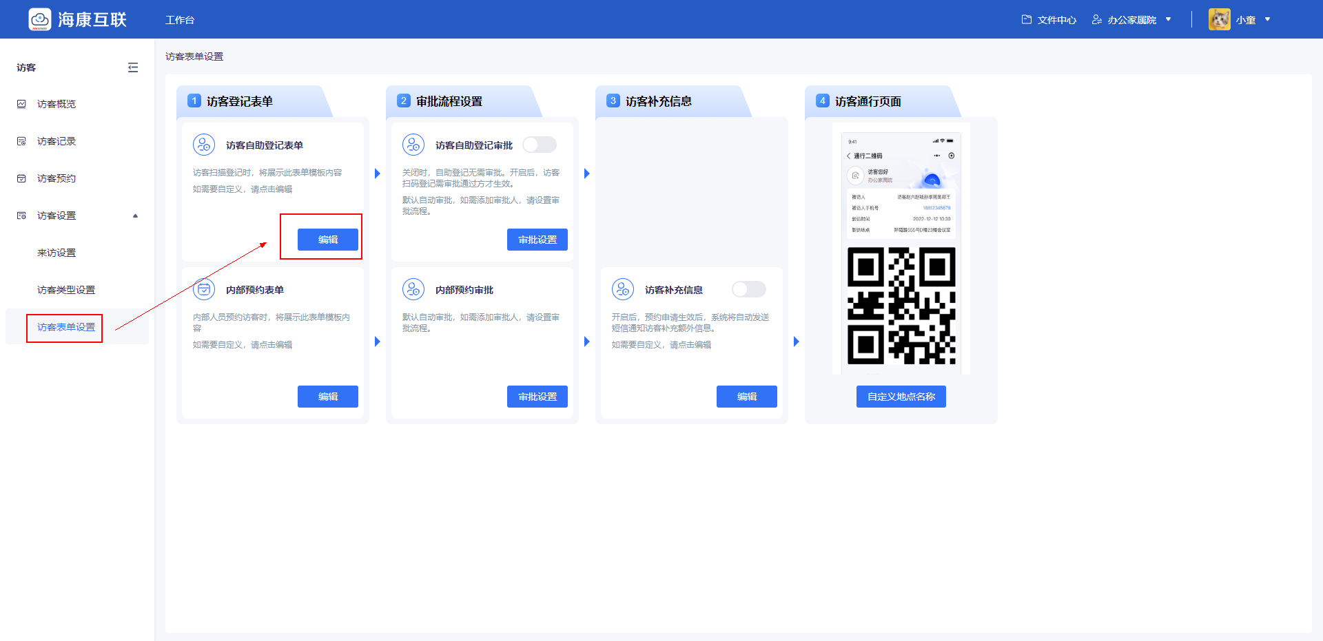 管理员可设置访客类型及对应的通行的门禁点,访客表单也可自定义修改。