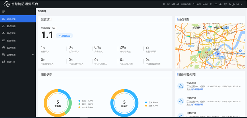 充电桩运营平台web端有七大模块(首页总览、站点地图、站点管理、设备管理、分润管理、订单管理、统计分析),用于运营商的站点日常运营操作及远程视频预览。