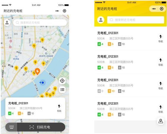 充电桩小程序(C端)面向最终C端用户使用,用户可使用该小程序搜寻附近充电桩、完成电动自行车充电和费用支付。