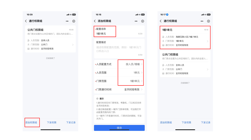 ④通行权限:管理员需要创建小区大门(公共门)权限组和各单元权限组,实现业主通行小区大门及自家楼幢单元门。
