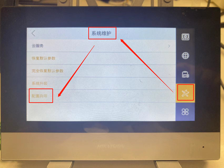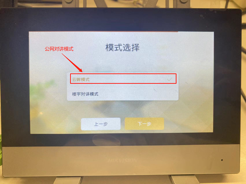 设备通电激活后,进入“设置-高级设置-工程设置”,输入设备密码后,选择“工程维护-配置向导”,参考如下流程将设备配置为公网对讲模式。