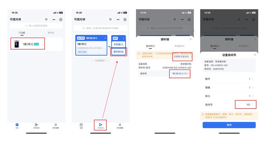 在海康互联App上将安卓室内机关联到对应的楼幢单元门口机,并设置该室内机的房间号,保存后即可完成呼叫配置。