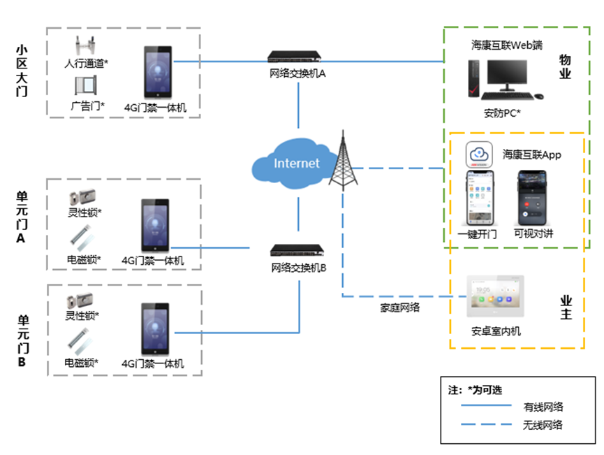 人员通行:采用4G门禁一体机+灵性锁/电磁锁,小区住户可以选择 刷脸或刷卡 方式认证通行,若忘记带卡可选择海康互联App“一键开门”快速通行。
