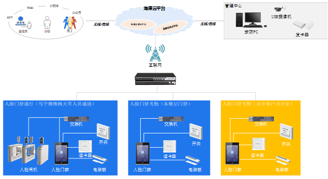 方案采用本地场景化、模块化安装硬件设备,云端系统平台管理,向物业管理员、企业租户工作人员、外来访客分角色,分权限,提供APP/Web/小程序/公众号多个入口,灵活便捷,安全有效。