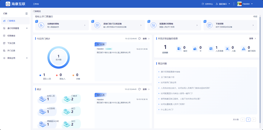 通行权限管理:除通行权限组及全下下发以外,通行权限管理仍可对门禁点分组、通行时间模板等基础设置操作,具体操作可跟随页面指引完成设置,让日常管理更加高效便捷。