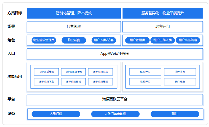 方案围绕降本提效和服务提升两个目标,围绕物业管理过程中人行管理、门禁管理、访客登记、信息通知发布等工作场景,进行角色刻画,依托海康互联云平台和海康威视人员通道、人脸门禁机等智能物联设备软硬件一体化解决方案,通过APP/WEB/小程序多个入口,实现门禁管理、远程开门等功能应用。