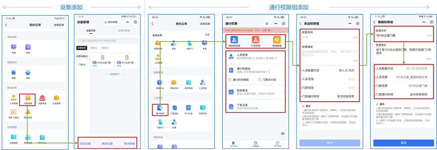 设备添加:设备添加可通过APP首页设备管理,或在应用中心的基础应用模块的设备管理进行操作,按照页面指引进行设备添加,并进行设备名称的编辑。