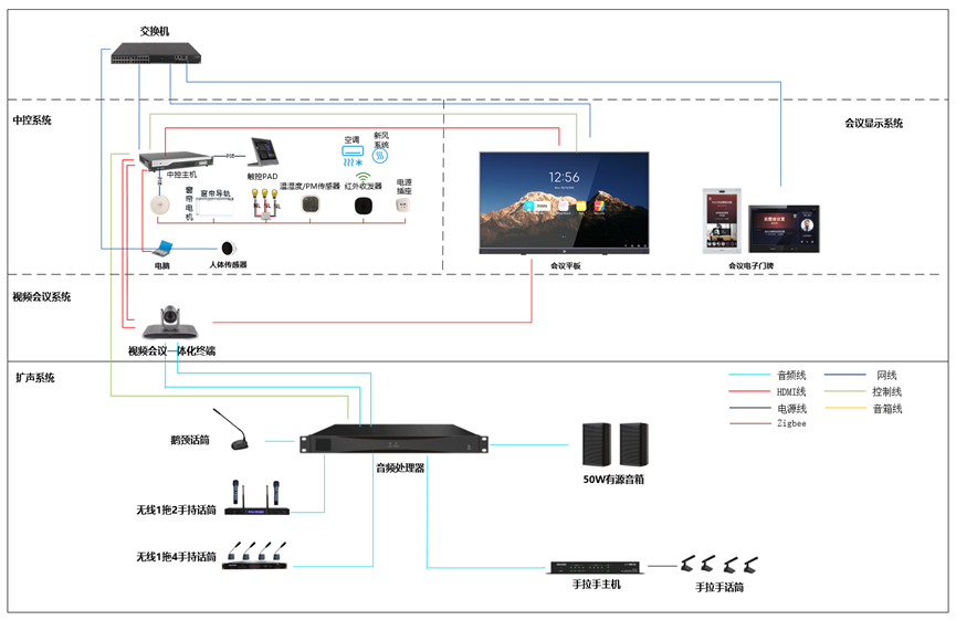 物联设备接入:物联中控主机,通过以红外、ZigBee、RJ485等控制方式,将灯光、空调、窗帘等环境设施,会议平板、视频会议终端、无纸化终端、会议录播主机、会讨设备、扩声设备等会议设备接入进行统一管理,搭建便捷、节能的智能控制系统。同时可支持通过智能网关,以红外、ZigBee等控制方式,将灯光、窗帘、空调等设备的接入,实现基础的智能设备控制。
