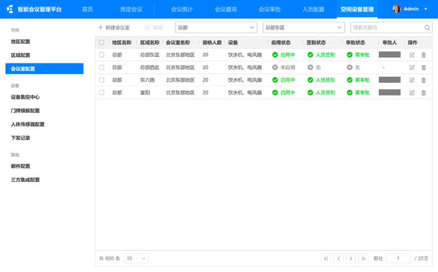 会议室空间配置:支持地区、区域、会议室(类型、设备设施、容量等)等基础信息配置,以及会议签到、通知规则、权限管理配置等。