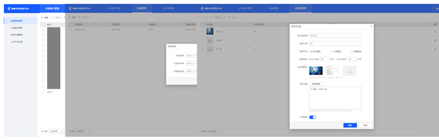 会议系统后台管理:系统后台管理满足企业用户管理、设备管理、会议室空间管理。可实现企业成员邀请、人员下发及人员管理,支持添加会议平板、电子门牌,通过会议室管理进行会议室空间信息登记、设置签到方式(包括会议签到、人员签到、无需签到)/签到时间、会议室图片、设备关联绑定管理以及门禁启用。