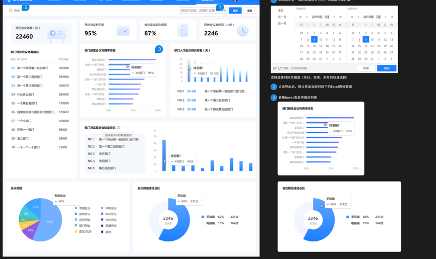 会议数据统计:支持按照时间筛选如本日、本周、本月、详细搜索导出数据统计分析结果。分析数据包含:会议预定场数、预定会议室利用率、会议室实际利用率、会议室提前释放节省的时间、部门预定会议场数排名、部门预定会议利用率排名、部门异常取消会议排名、会议预定途径占比、临时会议占比、部门人均会议时长等数据。借助分析数据辅助会议室管理人员进行会议室改进提升。
