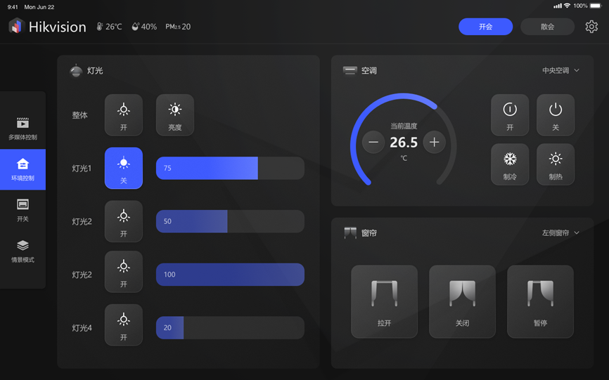 环境设施控制调节:支持会议设备及环境设施的设备在线/离线等状态显示,支持基于会议签到/结束时间,按照情景模式配置规则,实现会议室内的会议环境设施(灯光、空调、窗帘)的自动开关;支持基于PC/移动端进行非接触式的环境设施的手动调节,避免会议干扰。
