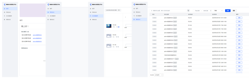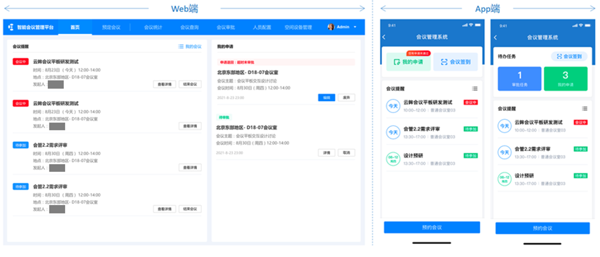 系统首页:以用户为中心,电脑端及移动端均可展示相关会议信息,包含待审批的会议、待参加的会议、预定过的会议等。