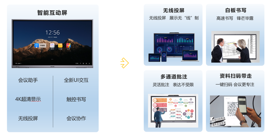 会中协作便利性:基于不同的会议室定位,提供便捷的会议室内投屏、电子白板、远程协同等应用,提升会议效率与体验。