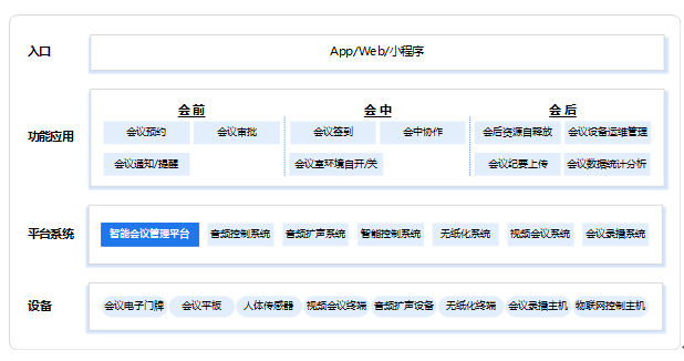 智慧办公智能会议室场景下,以智能会议管理平台集成智能硬件设备,提供软硬件一体化功能应用,实现操作便捷、体验舒适、管理高效、环境低碳节能。满足通过智能化手段提升高效管理和便捷会务体验,提供会前预约、通知、提醒,会中签到、协同、智能节能,会后统计、纪要上传等成熟稳定的智慧办公应用。