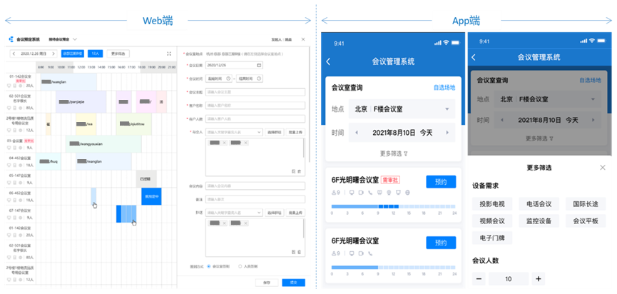 会议预约/提醒/统计:支持通过电脑端、移动端、会议电子门牌端实现会议室预约。电脑端支持按照会议室类型、日期、区域、设备要求及会议室大小相关条件进行筛选,显示各个会议室的时段占用情况。移动端支持按照会议室类型、日期、区域、设备要求及会议室大小相关条件进行筛选,直观显示当前筛选条件下,各个会议室的时段占用情况进行预定。会议电子门牌上可支持直接空档时间会议室预定。