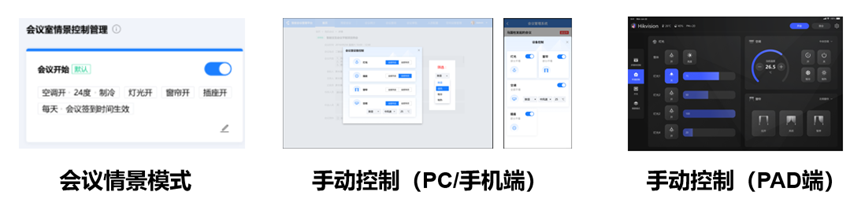 多形态控制模式:支持会议情景模式的配置,基于会议签到/结束时间,自动实现会议室内的会议环境设施(灯光、空调、窗帘等)、会议设施(会议平板、会讨设备、扩声设备、无纸化终端等)的自动开关,简化会议组织者工作,减少能耗浪费。支持会中多终端(PC/手机/PAD)的一键控制调节,避免会议干扰,提升会议舒适性及智能性。
