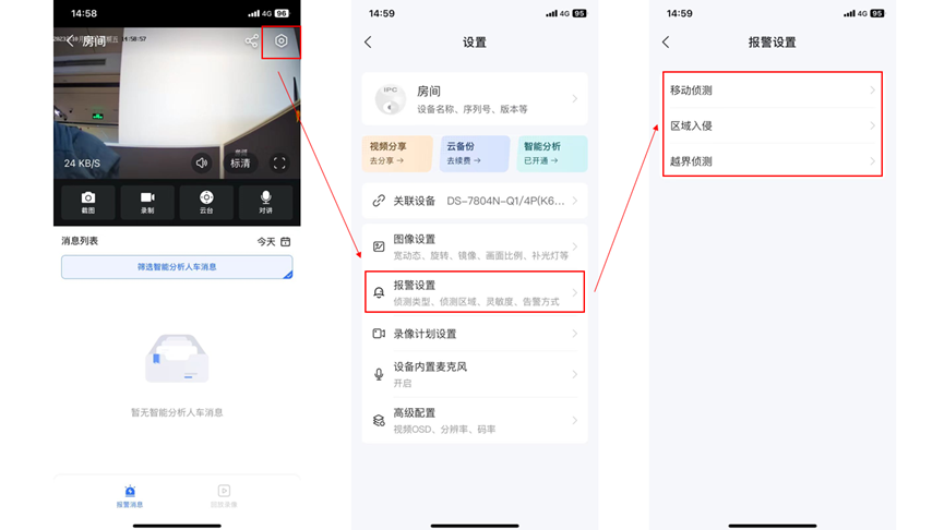 ②智能报警:智能警戒相机自带智能报警功能,用户可选择对应的摄像机,点击右上角进入设置界面,选择“报警设置”,可选择对应开启的智能功能。