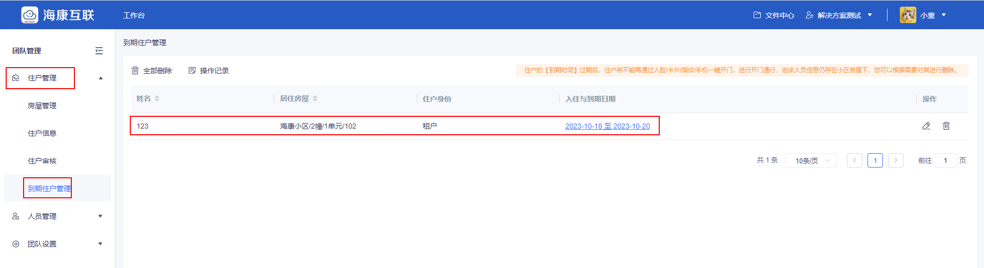 ②若租客不续租,房东在“到期住户”中删除该租客信息,租客无权限通行。