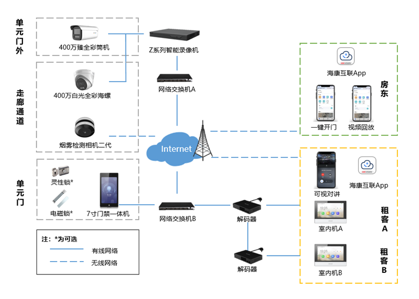 每层弱电井部署数字解码器通过网线连接各户数字室内机,各层数字解码器手牵手级联,并与单元门口机通过网线连接,租客在家接听快递、外卖可视对讲呼叫,远程一键开门。