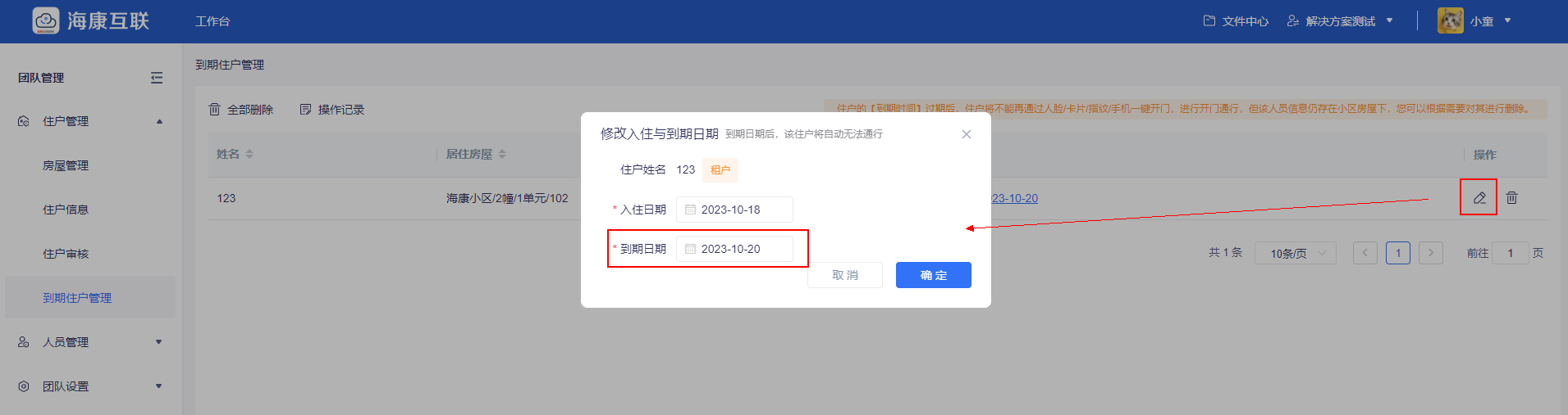 海康互联web端-租客到期管理界面图
