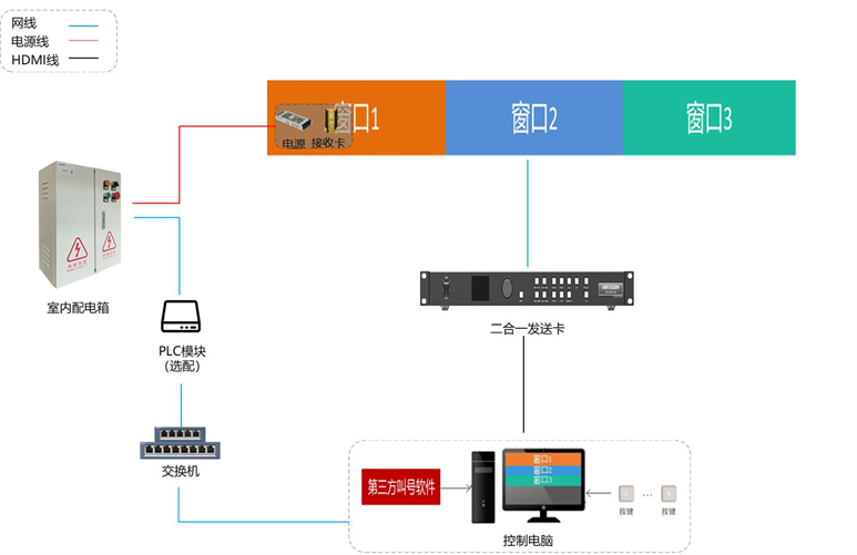 同步显示方案是利用第三方叫号软件在电脑桌面上直接播放显示内容,再通过发送卡将电脑多个画面进行缩放、截取等方式完整的显示到大屏的不同区域上。电脑上的各窗口内容根据软件上的拓扑图排布,遇到超长或超宽屏时可通过打折的方式带载。推荐采用海康威视二合一发送卡,支持画面处理、多信号源输入,具备多窗口功能,输出可超宽超高,带宽更加灵活,带载能力更大。