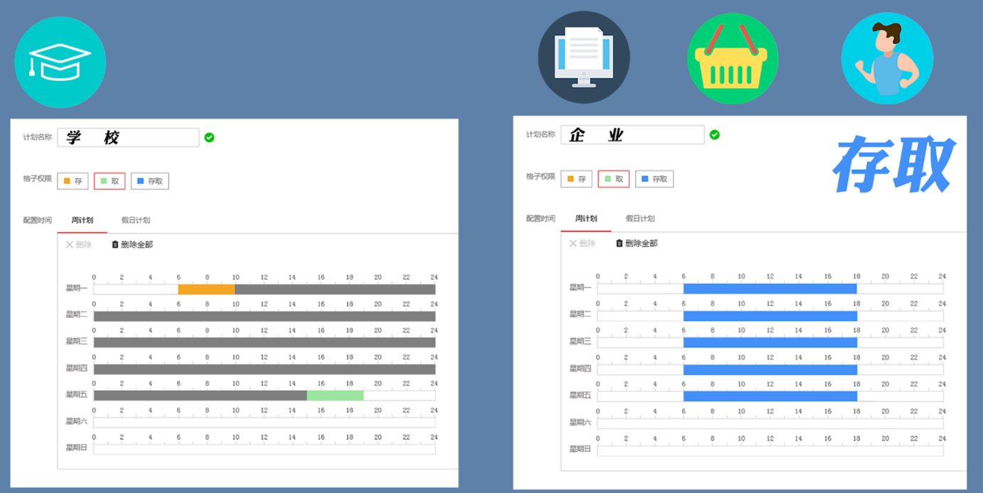5、不同场景,轻松适应:在学校、企业、超市、健身房等不同场景中,可以通过自定义时间计划模板,设置存取禁用时间段,实现对重要文件存储、个人物品存储、物品寄送、物品转交等功能。