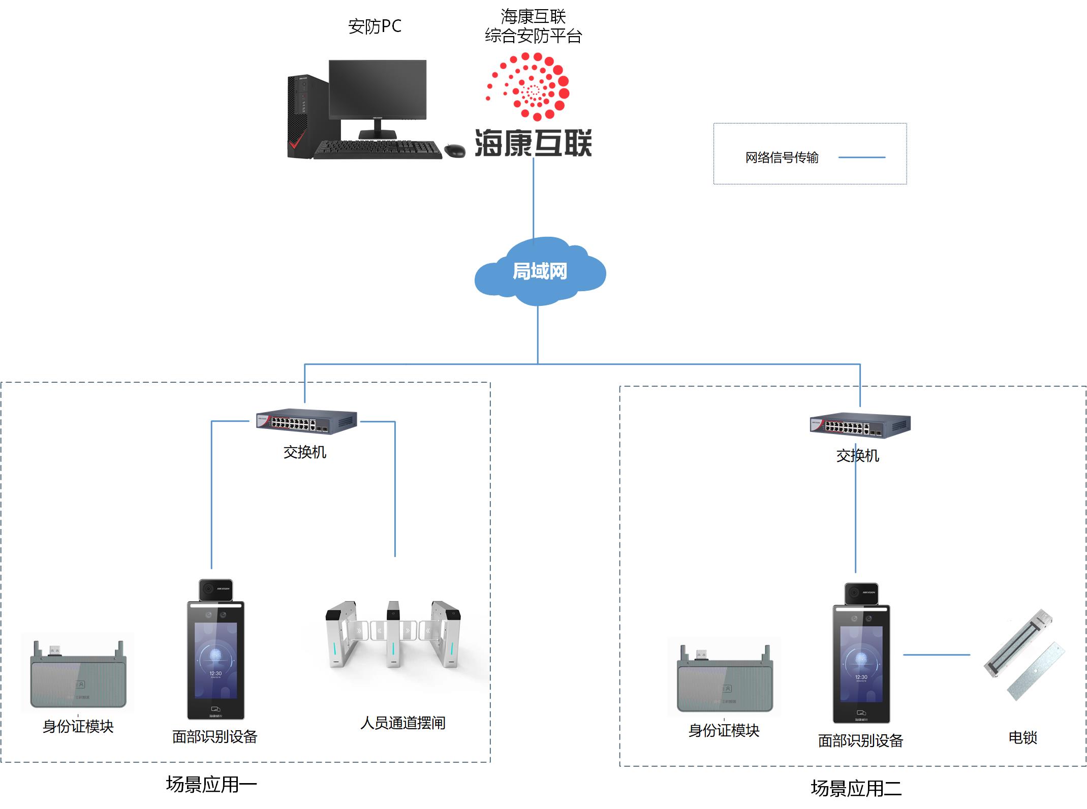 面部识别设备存储人员信息的原始数据和通行记录数据,并处理面部信息比对,控制人员通道开闸;面部识别设备安装在人员通道上,进出人员在面部识别设备上做认证;面部识别设备通过网络跟平台连接,实现面部信息同步及事件上传。