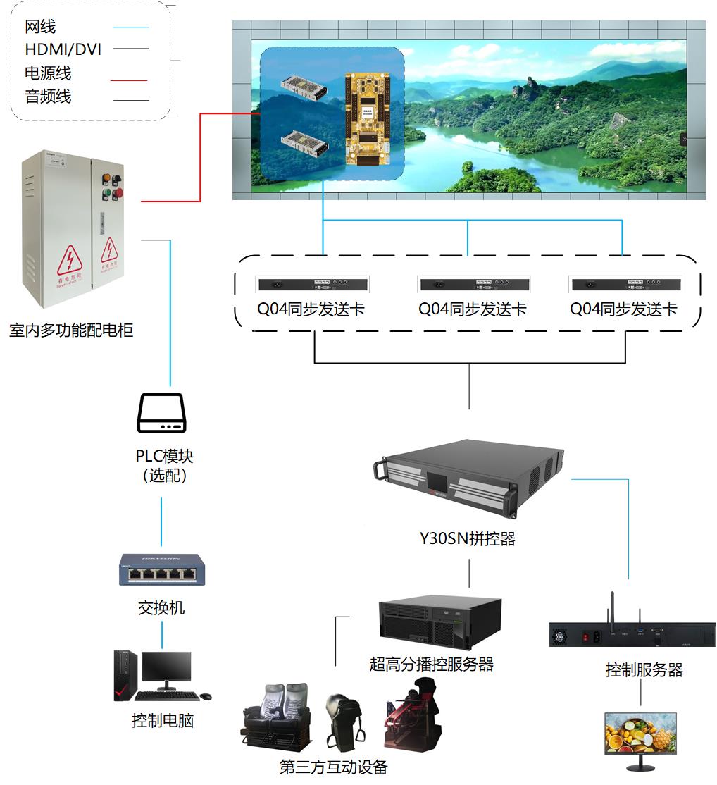 5)沉浸式系统拼控设计。推荐使用Y30SN系列多屏控制器是。相较于传统控制器,Y30SN拥有全新的系统架构,采用数据双交换技术,支持大容量数据传输及处理。支持多路高清、超高清信号的接入和实时处理,采用主控板加输入输出板结构,能够实现多屏管理,同时还支持独立音频输出,进一步提高沉浸式真实性。