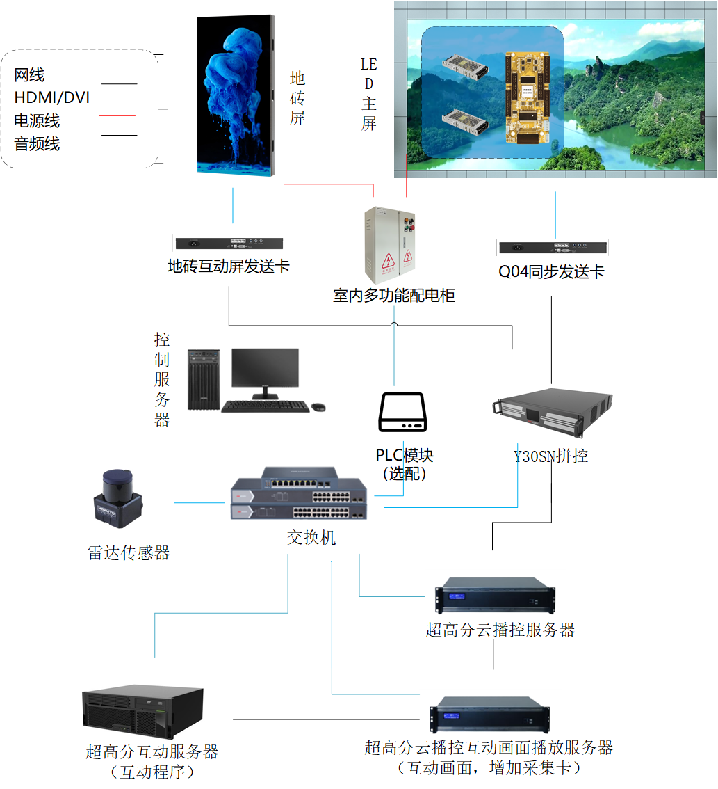 3)LED互动主屏控制系统设计。雷达大屏互动采用同步发送卡,直接接收C30S凭空器输出的视频信号。推荐选用带载能力可以达到230W的DS-D43Q04系列发送卡,接收卡使用DS-D43R16-N接收卡,不管是立式屏还是100~150寸的中型屏幕,都能拥有满意的选择。
