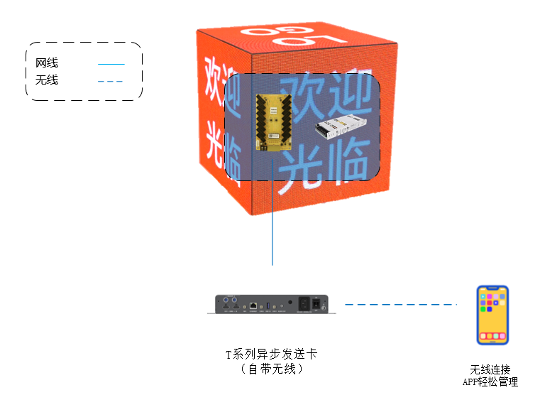 采用T系列异步发送卡,自带无线,不需网线连接,即可轻松连接到手机APP进行屏幕管理和节目管理,轻松管理魔方屏。