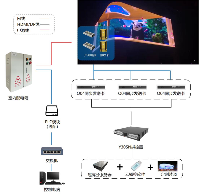 裸眼3D显示大屏为长期稳定高质量显示,需配备专业的拼接控制系统,可使用海康威视Y30SN系列多屏控制器,搭配同步发送卡DS-D43Q04和专业接收卡,保证大屏持久稳定播放。
