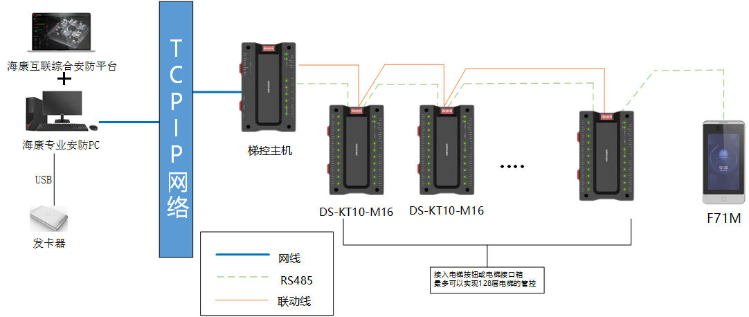 3、呼梯模式:与海康可视对讲系统联动,在室内机上按下“呼叫电梯”,联动电梯到达室内机所在楼层。在单元门口机上呼叫对接房号后,业主开门后,电梯自动呼到1楼。单元门口机/智能门禁机F72具有呼梯功能。
