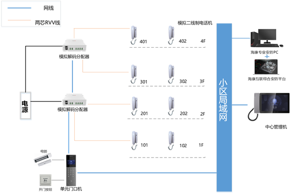 利用原有的入户线路其中二芯线,每一户线路上更换特定的二线制室内机及解码器;避免重新布线带来的墙体破坏;解码器与门口机之间通过网线连接,解码器与室内机之间通过两芯RVV线连接。