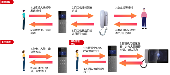 室内机呼叫:访客通过门口机呼叫二线制度室内机,住户确认身份无误后点击开门按钮,即可一键开门