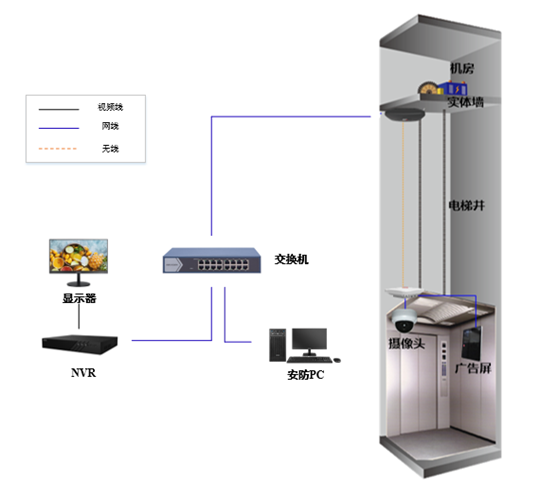 为记录电梯环境异常情况的发生过程(如电梯破坏事件,打架事件,电梯异常情况经过记录等),通常会在电梯内安装摄像机设备。传统的电梯信息传输方案,往往采用随行线缆做传输通路,由于电梯是经常移动的,一般的线缆极易破损断裂,并且采用模拟、低分辨率的摄像机,画质差,信号传输衰减大。使用一段时间后又不得不更换,导致二次施工,工作量大、成本高、不易维护、施工周期长。
