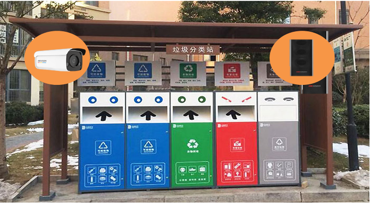 通过在垃圾分类集中投放点,安装海康威视智能警戒摄像机搭配智慧音柱,实现准确及时自定义语音提醒,通过海康互联客户端进行远程喊话,并可通过后端海康威视智脑系列NVR快速回查,将扔垃圾人员没有做到正确垃圾分类的图片和视频作为后期通报的内容